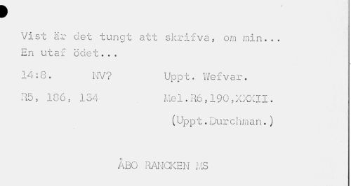 //// f //// Vist är det tungt att skrifva, om min... En utaf ödet... //// 14:8. NV? Uppt. V/ef var. //// R5, 186, 134 Mel.R6,190,XXXII. //// (Uppt.Durchman.) //// ÅBO RANCKEN MS ////