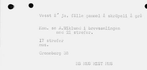 //// Vesst ä' ja, fälle garnmel å s-kröpeli å grå //// Kom. se A.Wiklund i brevsamlingen //// med 21 strofer. //// 17 strofer mu s. //// Croneborg 38 //// MS MUS HlST MUS ////