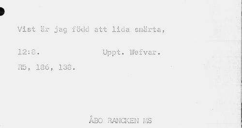 //// i //// Vist är jag född att lida smärta, //// 12:8. Uppt. Wefvar. //// x 15, 186, 138. //// » //// ÅBO RANCKEN MS ////