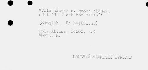 //// w v //// "Vita hästar o. gröna slädar, satt for . och kor haaan. //// (Sånglek. Ej beskrivn.) //// Upl. Altuna, 16603, s.9 Amark, M. //// LANDSMÅLSAHKIVET UPPSALA ////