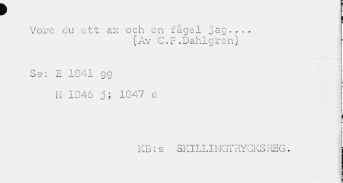 //// ¦ //// Vore du ett ax och en fågel jag... //// (äv C.F.Dahlgren) //// Se: E 1841 gg //// N 1846 j; 1847 e //// i //// = //// _ //// KB:s SKILLINGTRYCKSREG. //// ¦ ////