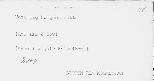 //// //r //// Vore jag kungens dotter //// (Arw III s 369) //// (Även i Vigstr Folkdiktn.) d/t? //// i //// BRODIN RIM KOMMENTAR : //// ¦ ////