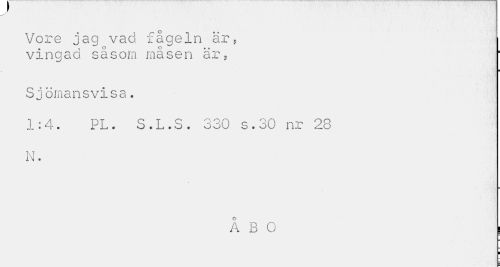 //// y //// Vore jag vad fågeln är, vingad såsom måsen är, //// ¦ //// Sjömansvisa. //// 1:4. PL. S.L.S. 330 s.30 nr 28 N • //// ÅBO I //// I ////
