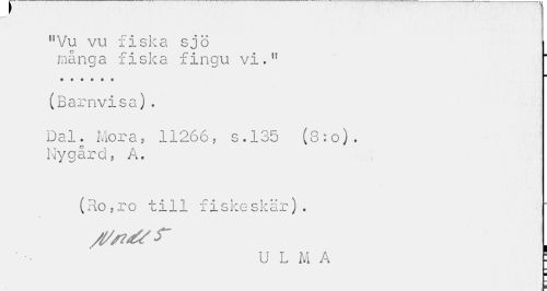 //// 11 Vu vu fiska sjö många fiska fingu vi.n //// (Barnvisa). //// Dal. Mora, 11266, s.135 (8:o). Nygård, A. //// (Ro,ro till fiskeskär). //// U L M A ! //// ¦ //// - ////