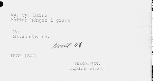//// I //// Vy, vy, barna katten hänger i grana //// Vg //// St.Sunclby sn. : //// IFGH 1842 ! //// NORD.MUS. Kopior visor I //// I ////