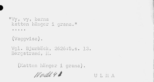 //// > //// flVy, vy ? barna katten hänger I grana.11 //// i //// . . . » . //// (Vaggvisa). //// Vgl. Bjurbäck, 2626:5,s. 13. Bergstrand, M. //// w //// (Katten hänger i grana). //// U L M A ! ////
