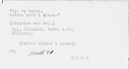 //// jr //// nVy? vy barna? katten satt i grana." //// i //// (Vaggvisa med mel.) //// Vgl. Filsbäck, 4690, s.73. Stålberc;. //// (Katten hänger i grana). //// 470 //// U L iv! A i //// I //// 1 ////