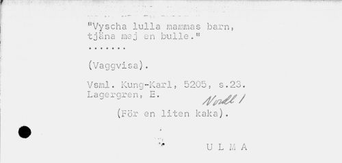 //// T //// f~ — ---ir -C T» J- T*" » - -T- ---1 * //// ~ w* • //// "Vyscha lulla mammas barn, tjäna mej en bulle.11 //// (Vaggvisa). //// Vsml. Kung-Karl, 5205, s.23. Lagergren, E. ^^/ //// (För en liten kaka). //// U L i A A ////