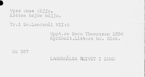 //// ¥ //// Vyss duss däjja, Katten hajde mäjja? //// Tr.i Sv.Landsmål VII;6 //// Uppt.av Sven Thomasson 1884 Kyrkhult,Listers hd. Blek. //// Nr 557 //// LÄNDS MAL SA RKIVET I LUND ////