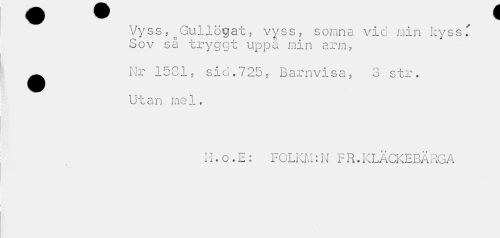 //// Vyss,oGullögat, vyss, somna vid min kyss T Sov så tryggt uppa min arm, //// ^ Nr 1581, sid.725, Barnvisa, 3 str. //// Utan mel. //// H.o.E: FOLKM:N FR.ICLÄCKE BÄRGA ////