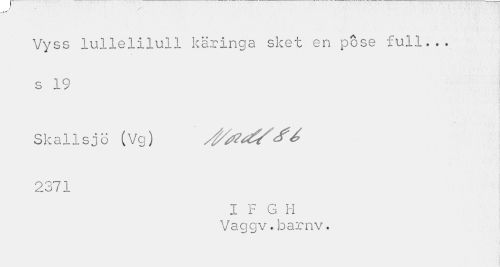 //// Vyss lullelilull käringa sket en pose full... //// s 19 //// Skallsjö (Vg) /g/rfd?/é //// 2371 //// I F G Ii Vaggv.barnv. ////