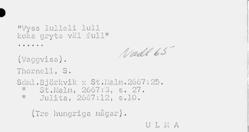 //// > //// "Vyss lulleli lull koka gryta väl full" //// ... , z^^és ' I //// lVaggvisa;. //// ~ ^ . ( //// Thorne11, S. j //// f //// Sdrnl. B j örkvik x St. Malm. 2667 : 25. " St.Malm, 2667:3, s. 27. " Julita, 2667:12, s.10. //// (Tre hungriga mågar). //// U L M A ////