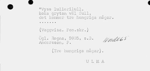 //// ^^ !,Vyss lullerilull, //// koka grytan väl full, //// det kommer tre hungriga mågar. //// (Vaggvisa. Fon.skr.) //// ögl. Re gna , 5935, s . 3. ^ //// Andersson, P. '" ; "' //// (Tre hungriga magar)« //// U L M A ////