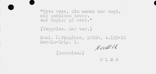 //// "Vyss vyss, din mamma har sagt, nar oskulden sover, små änglar cå vakt." //// (Vaggvisa. Me ci v ar.) //// Sdml. C.Vingåker, 10924, s.122-23 //// T- T A c • //// Nordin-Grip, i. //// (Barnvisor) //// U L M A I ////