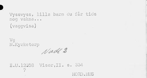 //// > //// J //// Vyssvyss, lilla barn ciu får tids nog vakna... //// (vaggvisa) //// Vg //// N.Kyrketorp //// E.U.12358 Visor,II. s. 334 //// ? //// NORD.MUS ////