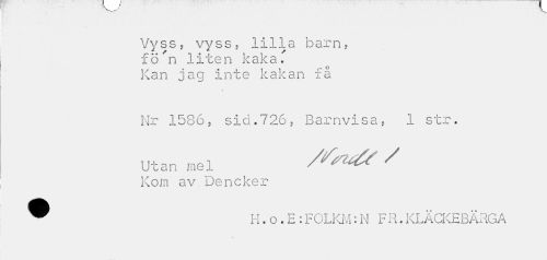//// Vyss? vyss* lilla barn, //// fö'n liten kaka. //// Kan jag inte kakan få //// Nr 15865 sid.726, Barnvisa, 1 str. //// Utan mel / //// Kom av Deneker //// ® H.o.E:FCLKM:N FR.KLÄCKEBÄRGA ////