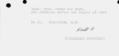 //// Vyss. vyss, mamma har sagt. //// Med oskulden sofver små änglar på vakt //// Nr 11. An g e rmldl E.S. //// ///isf/ //// NORDLANDER. BARNVISOR ////