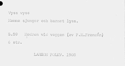 //// ¥ i //// Vyss vyss //// Mamma sjunger och barnet lyss, //// S.59 Modren vid vaggan (av F.M.Fransen) //// / //// 6 str. //// LARSON FOLKV. 1908 ////