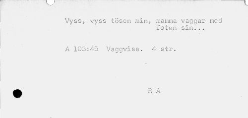 //// ( V. • i » • . .i I ' , ^ I. //// Vyss, vyss tösen min, mamma vaggar med //// foten sin... //// • » //// A 103:45 Vaggvisa. 4 str. //// • D A //// ri A //// ¦X ////