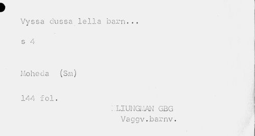 //// 9 //// Vyssa dussa lella barn.•. s 4 //// i //// ' ' o //// Moheda (Sm) 144 fol. //// l.LIUNGMAN GBG Vaggv.barnv. ////