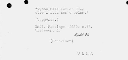 //// H> l^H //// "Vyssalulla för en kinn stor i röva som e qrinn." //// (Vaggvisa.) //// Smål. Frödinge, 4685, s.15. Claesson, L. //// (Barnvisor) //// i. //// v' //// / //// U L M A ////
