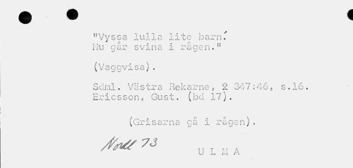 //// "Vyssa lulla lite barn T Nu går svina i rågen." //// (Vaggvisa). //// Sdml. Vä str a Rekarne, 2 347:46, s.16. Ericsson, Gust. (bd 17). //// (Grisarna gå i rågen). //// yftfl^A ^^ tit //// u l i. i r \ ////
