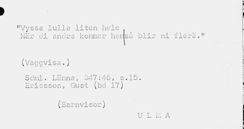 //// ? i //// "Vyssa lulla liten hele . L //// När di andra kommer herrjså blir ni flera." //// (Vaggvisa.) //// Sami. Länna, 347:46, s.15. //// Ericsson, Gust (bd 17) ! //// L % //// (Barnvisor) I //// U L M A ////