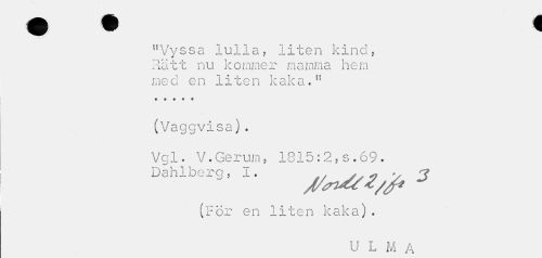 //// "Vyssa lulla, liten kind, Rätt nu kommer mamma hem med en liten kaka." //// (Vaggvisa). //// Vgl. V.Gerum, 1815:2,s.69. Dahlber9, J- 3 //// ("För en liten kaka) . //// U L M A ////
