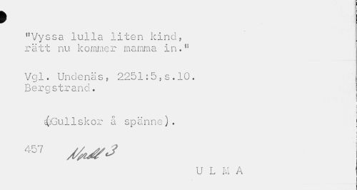 //// i //// "Vyssa lulla liten kind, rätt nu kommer mamma in." //// Vgl. Undenäs, 2251:5,s.10. Bergstrand. //// i //// d(;Gullskor å spänne). //// * r \ //// i L //// 457 sVufJ //// U L M A ////