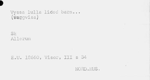 //// r //// | //// Vyssa lulla lided barn... (©aggvisa) //// c V //// Allerum //// i //// E.U. 18660, Visor, III s 34 //// NORD.MUS. ////