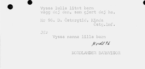 //// ^^ Vyssa lulla litet barn //// vagg dej den, som gjort dej ha, //// Nr 96. D. Östergtld, Kinda //// ** r* //// Cstg.Imx. //// T ^ ~ //// J x r //// Vyssa nanna lilla barn //// NORDLANDER BARNVISOR ////