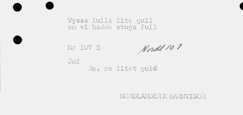 //// Vyssa lulla lite gull //// om vi hadde stuga full //// ^ Nr 107 B /j/si^/O ? //// r //// jmf //// Ro, ro litet guld //// NO DL AHDER K BARNVISOR ////