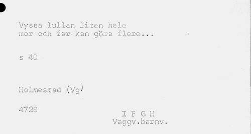 //// 9 //// Vyssa lullan liten hele mor och far kan göra flere... //// s 40 //// Holmestad (Vq^ I //// * //// - //// 4728 ! //// I F G H //// Vaqqv.barnv. ////