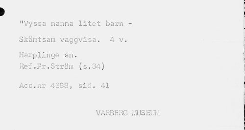 //// > E //// "Vyssa nanna litet barn - //// i //// Skämtsam vaggvisa. 4 v. //// Harplinge sn. //// Ref.Fr.Ström (s.34) //// Acc.nr 4388, sid. 41 1 //// i //// VARBERG MUSEUM ////