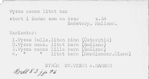 //// Vyssa nanna litet bar . //// stort i ändan som en kvar s.34 //// Snöstorp 5 Halland. //// Varianter: //// 1.Vyssa lulla,liten kinn (Östergtld) //// 2.Vyssa nana, litet barn (Småland) //// 3.Vyssa nanna lilla barn (Småland) //// 4. 11 " litet barn (Nordlander,Öland) //// STRÖM SV.VISOR o.RAMSOR ////