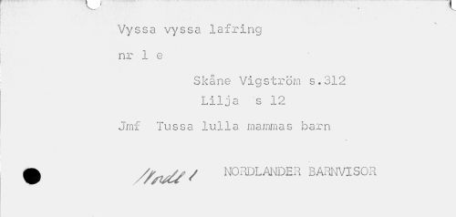 //// Vyssa vyssa lafring nr i e //// Skåne Vigström s.312 Lilja s 12 //// Jmf Tussa lulla mammas barn 9 //sv// / NORDLANDER BARNVISOR ////