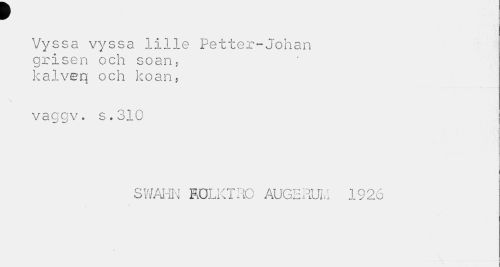 //// F //// Vyssa vyssa lille Petter-Johan grisen och soan, kalven och koan, //// vaggv. s.310 //// SWAHN KDLKTRO AUGERUM 1926 ////