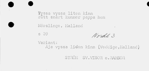 //// ¥yssa vyssa liten lcinn ratt snart kommer pappa hem //// Nörslinge? Halland S 39 //// V a r i a n t • //// Aja vyssa liden kinn (Veddige,Halland) //// STRÖM SV. VISOR o . RAMSOR ////