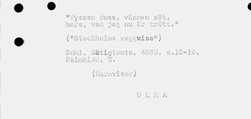 //// "Vyssan duss, vännen söt, hors, vad jag nu är trött." //// •("Stockholms vagevisan) //// / //// Sdml, SStigtomta, 4883, s. 15-16. //// Palmblad, W. //// (Barnvisor) //// U L M A ////