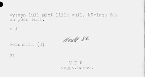 //// f //// Vyssan lull mitt lilla gull, käringa fes en pose full. //// s 1 //// Forshalla (B) 31 //// V F F //// vaggv.barnv. ////