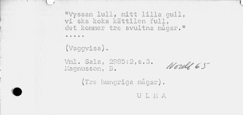 //// \ //// "Vyssan lull. mitt lilla gull, vi ska koka kättilen full, det kommer tre svultna mågar.11 //// Iw» //// (Vaggvisa)* //// Vml» Sala, 2085 • 2. ? s • 3 ? , ? / f Magnusson, B. /j/fyat* j //// (Tre hungriga magar). ////