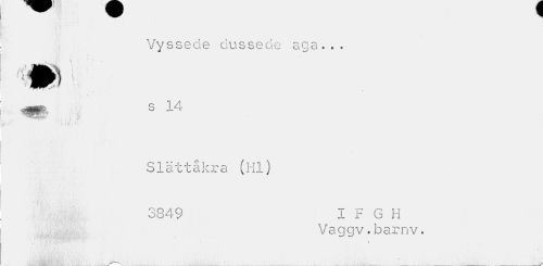 //// Vyssede dussede aga... //// m1 //// imm s 14 //// ^^ff* , i f //// , Vi* //// Slättåkra (Hl) //// 3849 I F G H //// Vaggv.b 3rnv 9 //// i //// « i ////