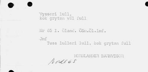 //// Vysseri lull, //// kok grytan väl full //// Nr 65 I. 01and. OSm.öl.lmf. Jmf //// Tuss lulleri lull, kok grytan full //// NORDLANDER BARNVISOR ////