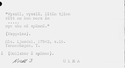 //// ) //// "Vyssäl, vyssla, litän tjinn rätt nu kom mora In //// t fi « « c //// nye sko mä spänna." (Vaggvisa). //// I Ils. Ljusdal, 17542, s.16. //// r~r—i ft-t //// Tannerhagen, i. å (Gullslcor å spänne). //// 3 U L M A //// \ ////