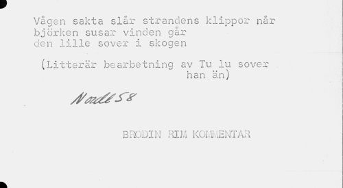 //// Vågen sakta slår strandens klippor når björken susar vinden går den lille sover i skogen //// (Litterär bearbetning av Tu lu sover //// han än) //// * //// BRODIN RIM KOMMENTAR //// k ////