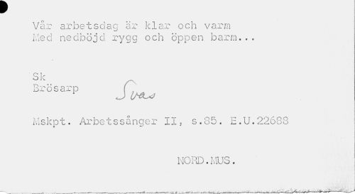 //// r //// Vår arbetsdag är klar och varm Med nedböjd rygg och öppen barm... //// Sk //// Brösarp (, //// 1 J iMLx) //// Mskpt. Arbetssånqer II, s.85. E.U.22683 //// NORD. MUS. //// \ ////