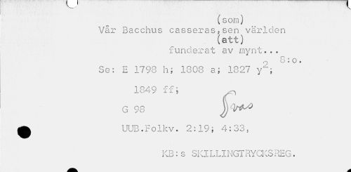 //// (som) //// Var Bacchus casseras.sen världen //// (att) //// funderat av mynt... //// Se: E 1793 h; 1803 a; 1327 y2; //// 1849 ££; , //// G 98 //// A UUB.Folkv. 2:19; 4:33s //// KB:s SKILLINGTRYCKSREG. ////