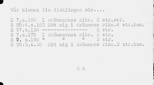//// I //// i //// Vår blomma fin älsklingen min... //// B 7.S.190 I drömmarnas rike. 2 str.ref. B 95:4,s.162 Möt mig i drömmens rike.4 str.kom. //// B 97,s.124--- 2 str. //// B 7,s.175 I drömmarnas rike. 3 str. : //// B 0, s.190 " » 11 3 str. : //// B 95:3,s.38 Möt mig i drömmens rike.2 str.kom. //// = //// P A //// k ////