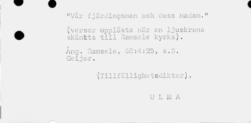 //// f,Vår fjärdingsman och dess madam.{! //// ^^ (verser upplästa när en ljuskrona //// skänkts till Ramsele kyrka). //// Ang. Ramsele, 68:4:25, s.3. Geijer. //// (T i11f ä11ig he t e di kter). //// U L M A //// % ////