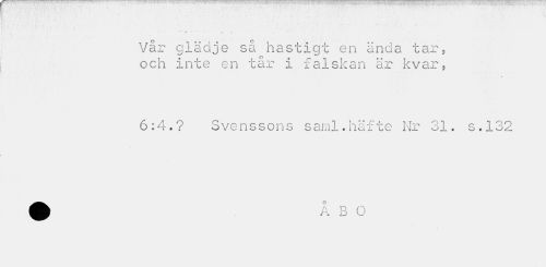 //// Vår glädje så hastigt en ända tar, och inte en tår i falskan är kvar,. //// 6:4.? Svenssons saml.häfte Nr 31. s.132 ////